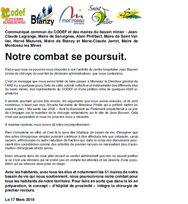Le CODEF : Notre combat se poursuit by cncdhmp19 mars 201913 h 51 minCommentaires fermés sur Le CODEF : Notre combat se poursuitActions et interventions, Hôpital, Non classé, Régions Communiqué Notre combat commun