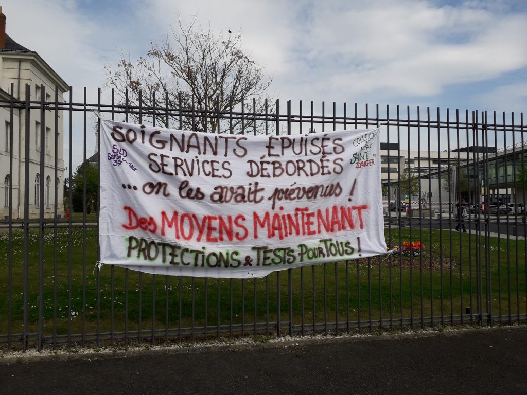A l’occasion du 7 avril, journée mondiale de la santé, une banderole revendicative a été accrochée sur les grilles de l’hôpital Bretonneau (CHRU de Tours)