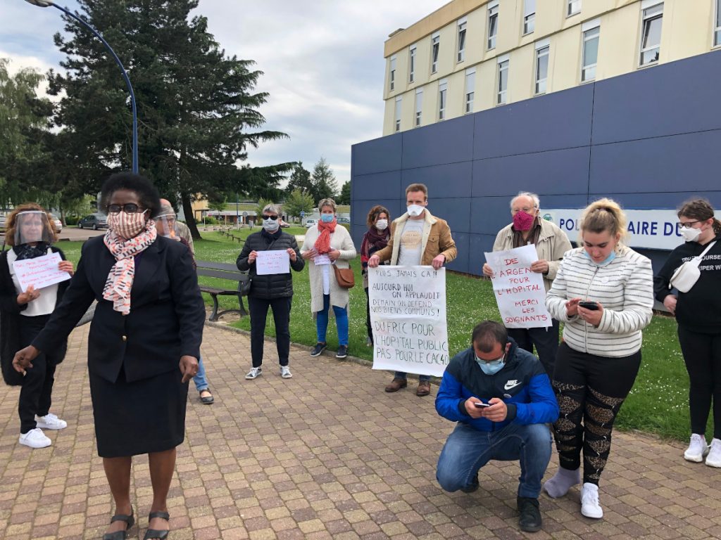 Des membres du comité de défense de l’hôpital de Gisors viennent saluer les soignants, dialoguer à l’entrée de l’établissement avec les médecins et le personnel en ce début de déconfinement