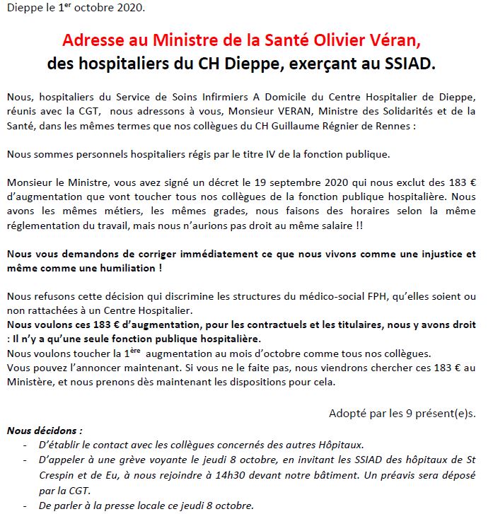 SSIAD de DIEPPE – Adresse au ministre de la santé by Rolland11 octobre 20208 h 13 minCommentaires fermés sur SSIAD de DIEPPE – Adresse au ministre de la santéFinancement, Hôpital Adresse au Ministre de la Santé