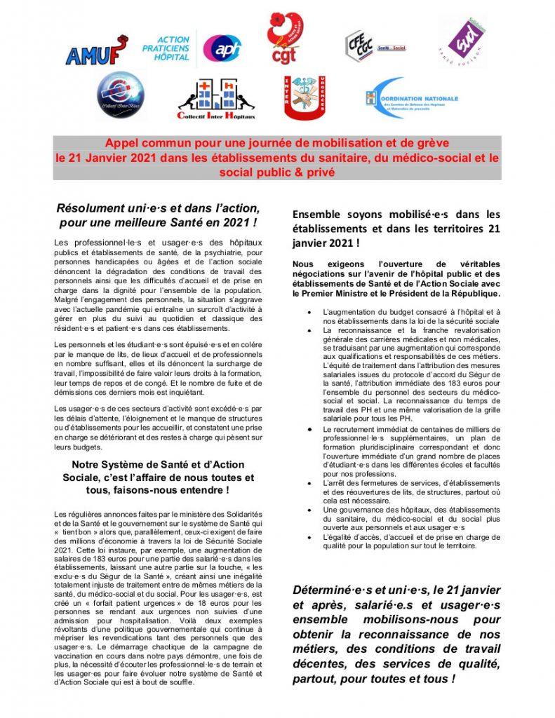 Appel commun à la mobilisation pour l’hôpital public le 21 janvier by michelelfn12 janvier 202118 h 44 minCommentaires fermés sur Appel commun à la mobilisation pour l’hôpital public le 21 janvierActions et interventions, Hôpital L’appel Unitaire