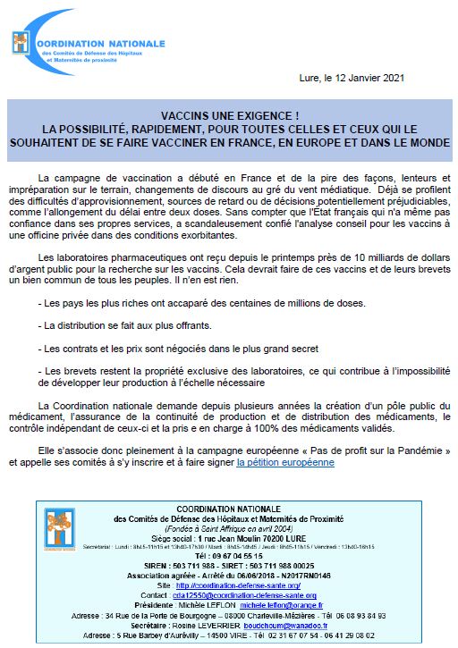 Commentaires fermés sur Communiqué de la Coordination Nationale du 12 Janvier 2021 – Vaccins une exigence ! La possibilité, rapidement, pour toutes celles et ceux qui le souhaitent de se faire vacciner en France, en Europe et dans le monde