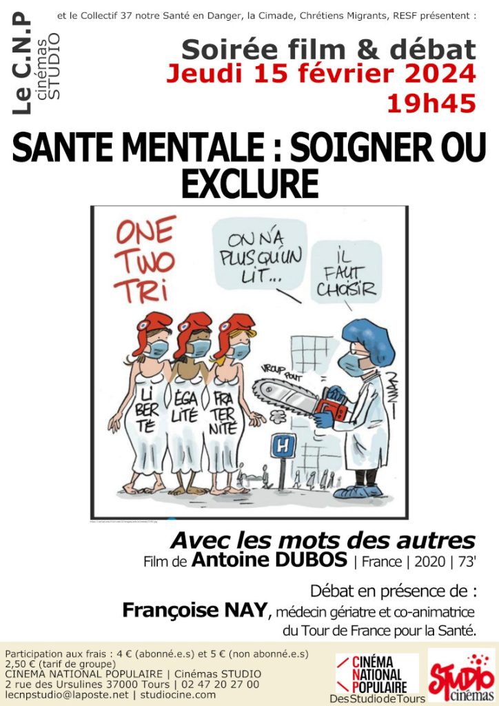 Une soirée aux Studios à Tours sur le thème la santé mentale soigner ou exclure, organisée par le collectif 37 Notre Santé en danger dans le cadre du CNP Cinéma National Populaire, en collaboration avec des associations de soutien aux migrant.es: Emmaus 100 pour 1, RESF, et la CIMADE :