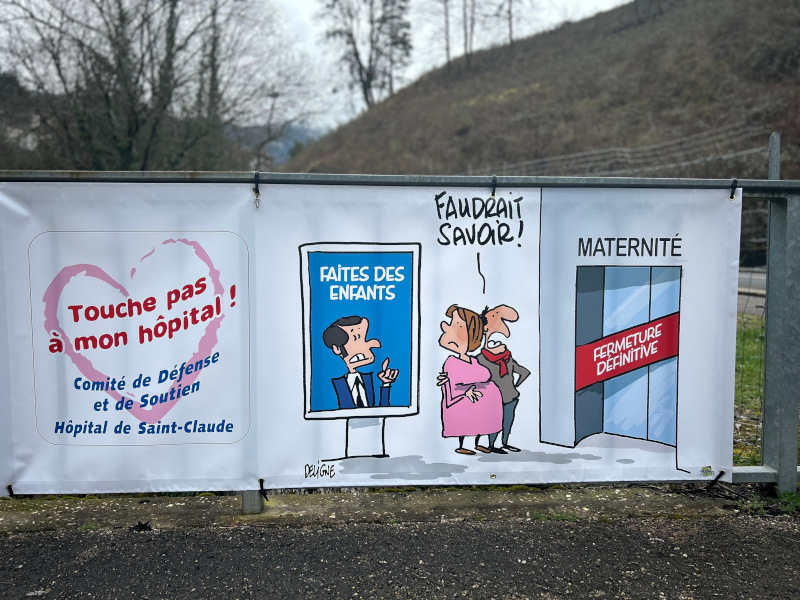 Dévoilement de la nouvelle banderole du Comité le mardi 12 mars devant le Centre hospitalier de St Claude.