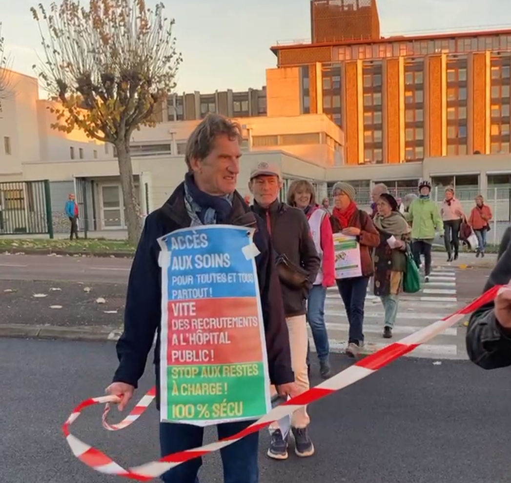 Mardi 4 novembre, la chaîne humaine est partie de l’hôpital Pasteur à Dole pour rejoindre la Sécu (CPAM du Jura) au moment où s’engageait le débat à l’assemblée nationale sur le PLFSS 2026 qui prévoit des coupes dramatiques dans le domaine de la santé publique et des prestations sociales.