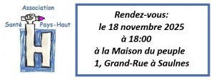 A ce titre, l’association Santé Pays-Haut vous invite cordialement à une rencontre, en présence de Michèle Leflon, présidente de la Coordination Nationale des comités de défense des hôpitaux et maternités.