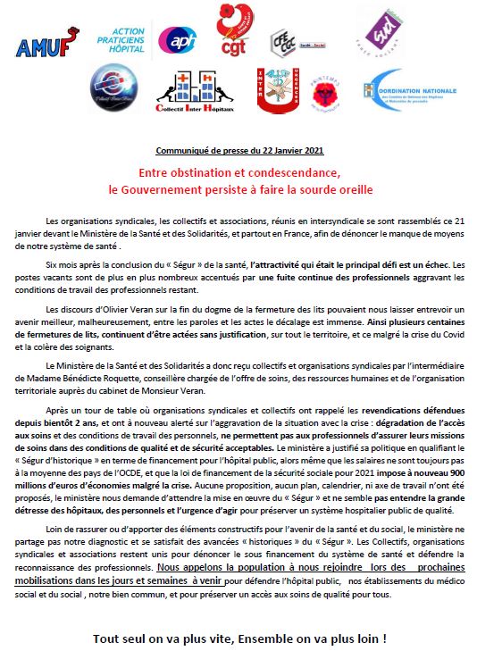 Communiqué de presse unitaire du 21 Janvier 2021 : Entre obstination et condescendance, le Gouvernement persiste à faire la sourde oreille
