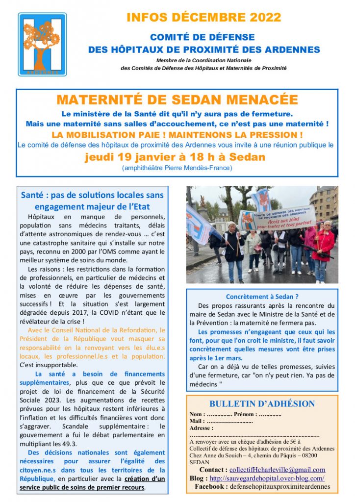 Mais c’était aussi le lendemain d’une réunion du personnel concerné de l’hôpital de Sedan avec le directeur du CHINA (Centre Hospitalier Intercommunal Nord Ardennes) de préparation psychologique de la fermeture de la maternité, du service de surveillance continue et de la néonatalogie si l’hôpital ne trouve pas d’anesthésistes avant le 1er mars.